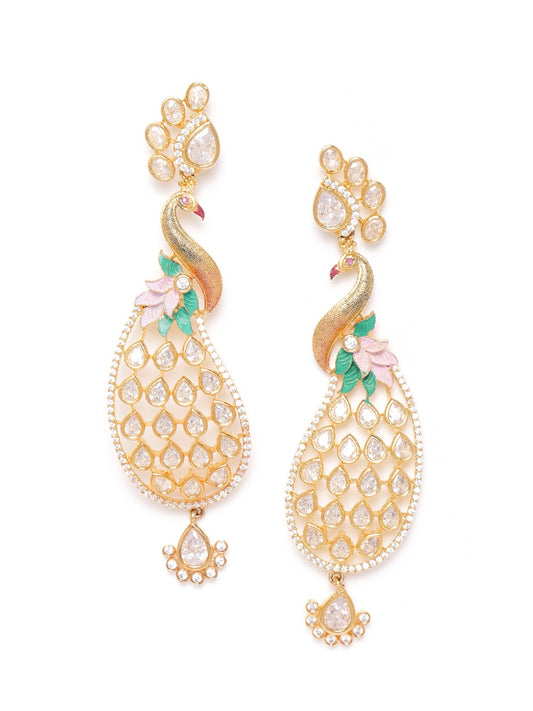 Peach-Coloured Gold-Plated Handcrafted AD Stones Peacock-Shaped Drop Earrings