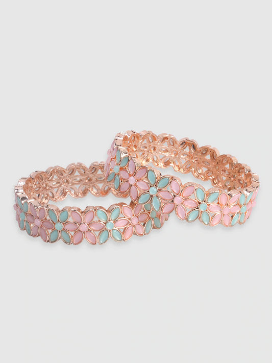 Set Of 2 Gold-Plated Pink & Turquoise Blue Stone-Studded Handcrafted Bangles