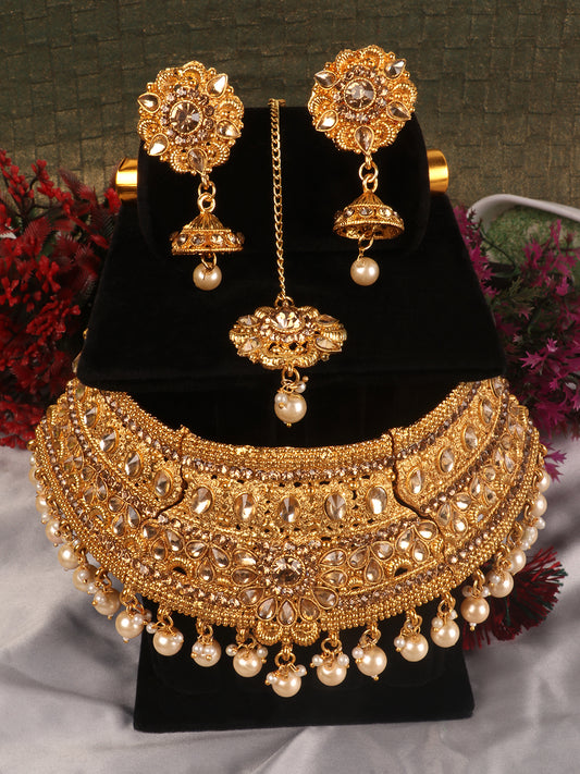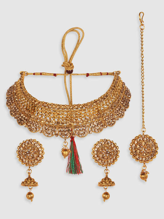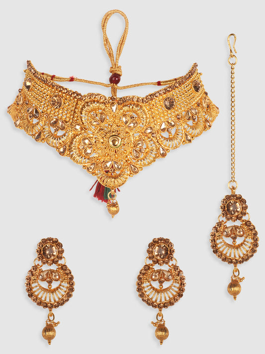 Gold Plated Stone Studded Choker Set with Chandbali Shape Earring & Maangtika