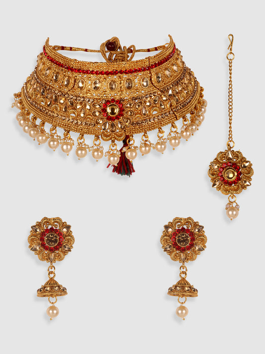 Red & Gold Toned Gold Plated Bridal Kundan Studded Choker Set