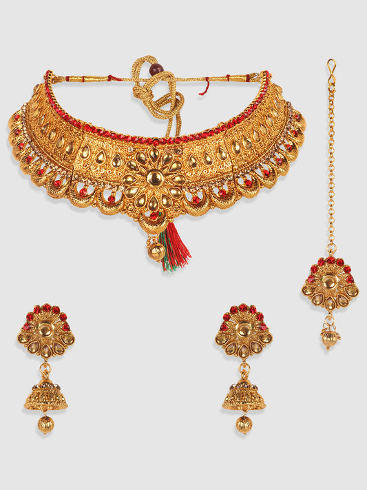 Gold -Toned & Red Floral Stone Studded Choker Set