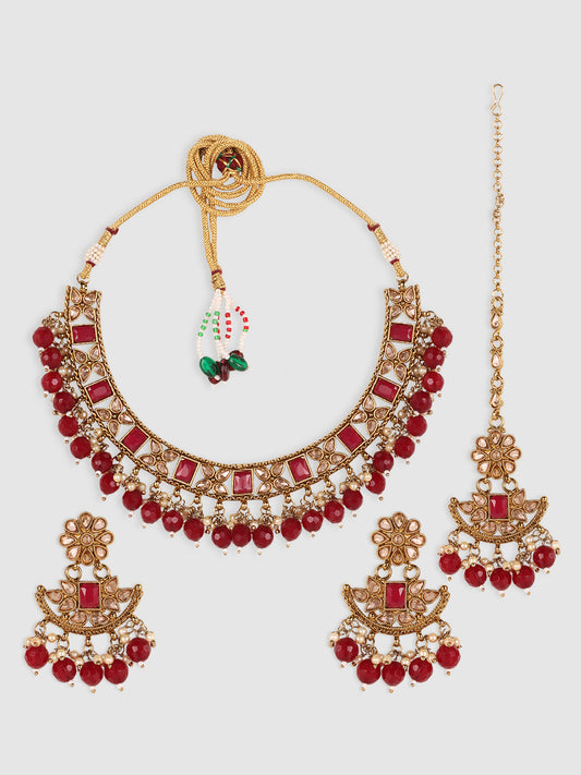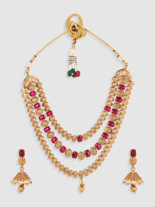 Gold-Plated Maroon Stone-Studded & Beaded Jewellery Set