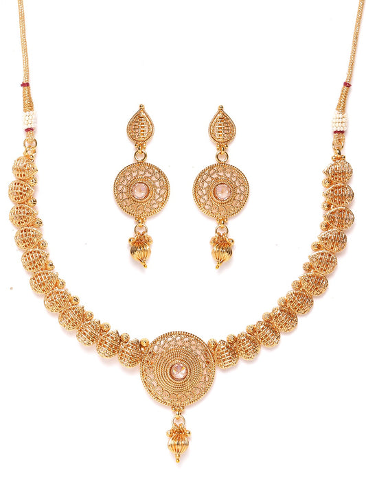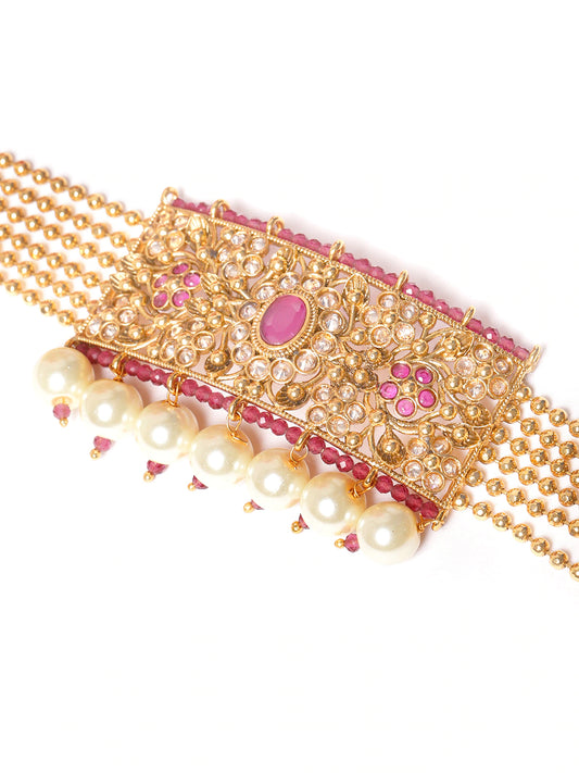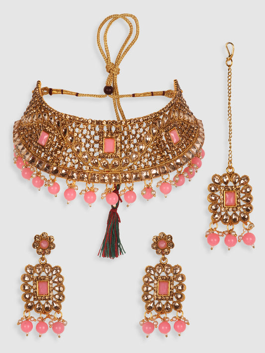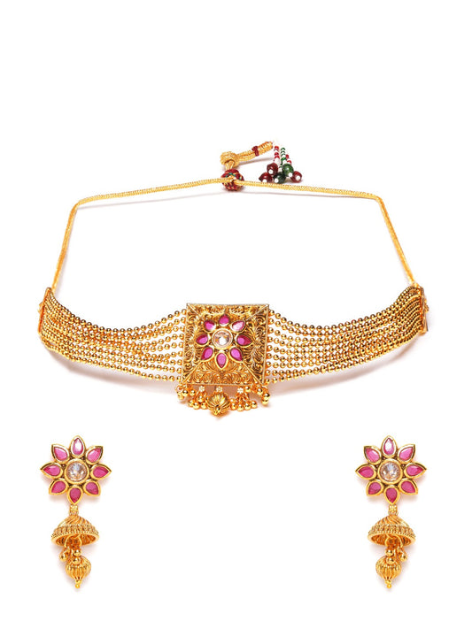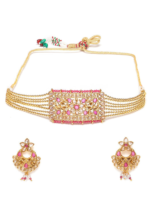 Gold-Toned & Pink Stone-Studded Choker Jewellery Set