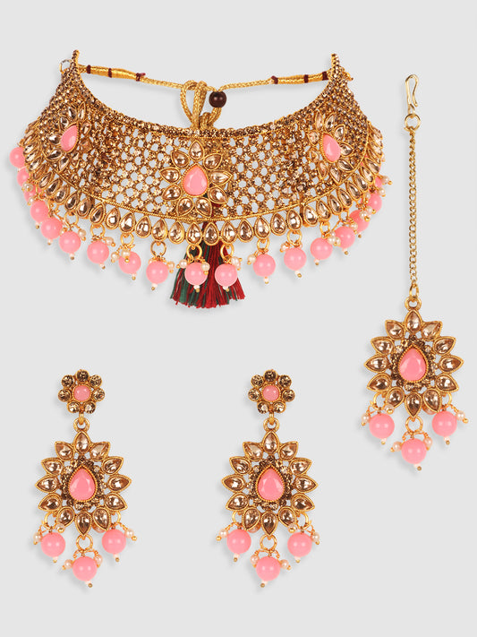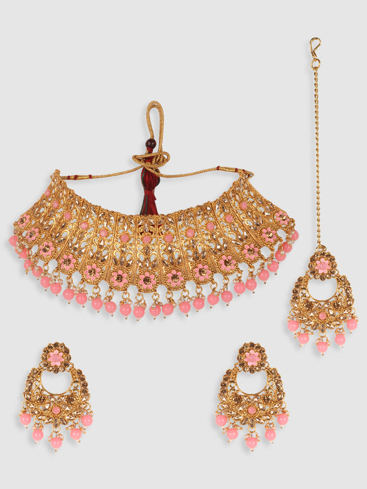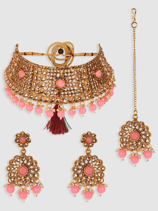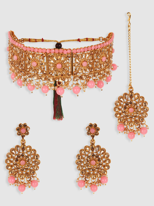 Woman Pink &Gold Plated Studded Choker Set with Floral Earring & Maangtika