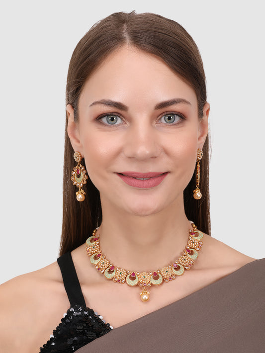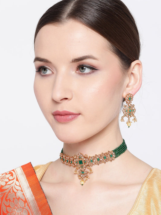 Green Gold-Plated Stone-Studded Beaded Handcrafted Jewellery Set