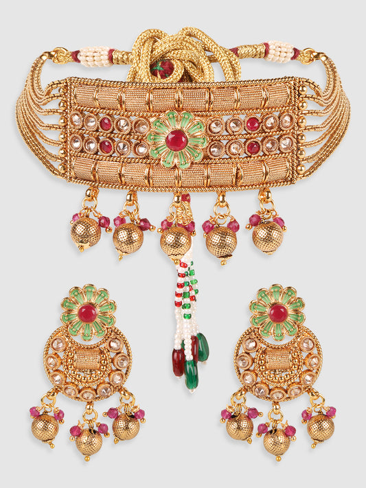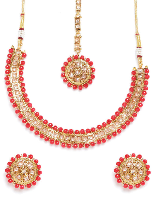Red Gold-Plated CZ-Studded & Artificial Beaded Handcrafted Jewellery Set