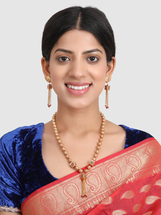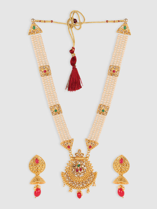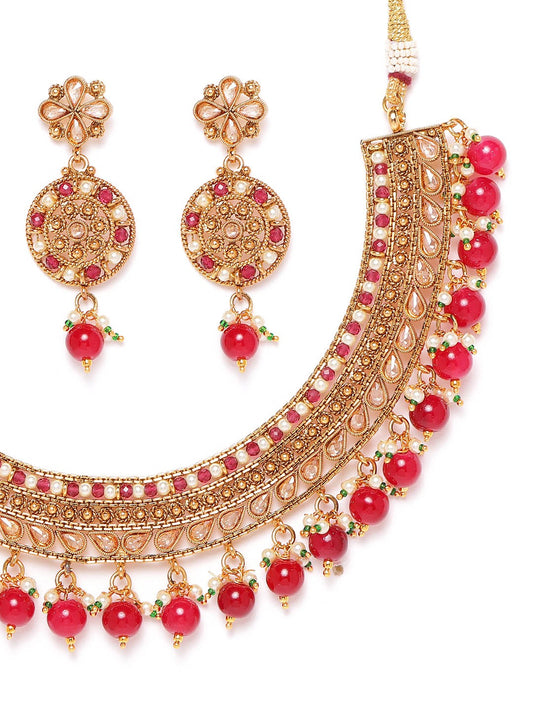 Red Gold Plated CZ Studded & Beaded Jewellery Set