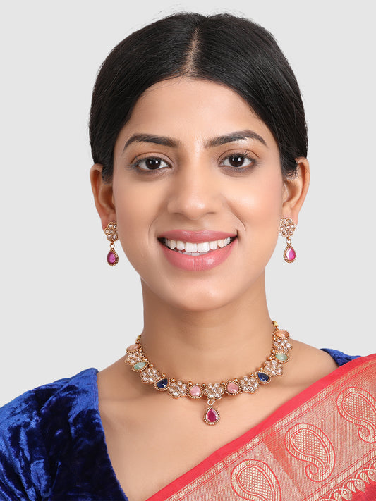 Gold-Plated Multi-Coloured AD-Studded & Beaded Jewellery Set