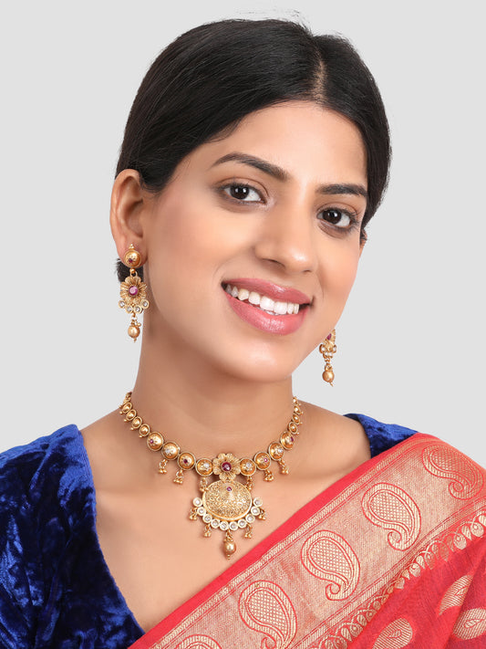 Magenta Antique Gold-Plated CZ-Studded & Beaded Handcrafted Jewellery Set