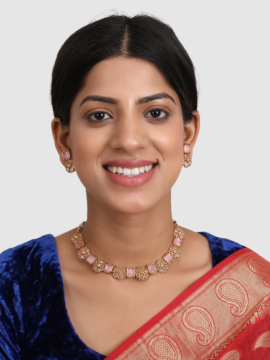 Women Gold-Plated Pink AD Studded Floral Designed Jewellery Set