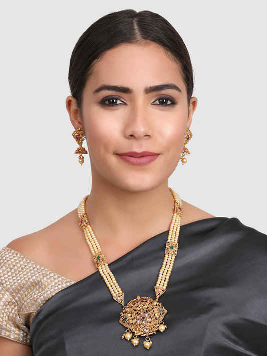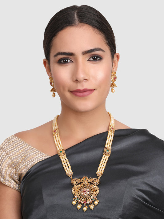 Gold-Plated Off White Pearl String AD-Studded Jewellery Set