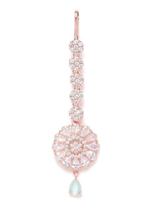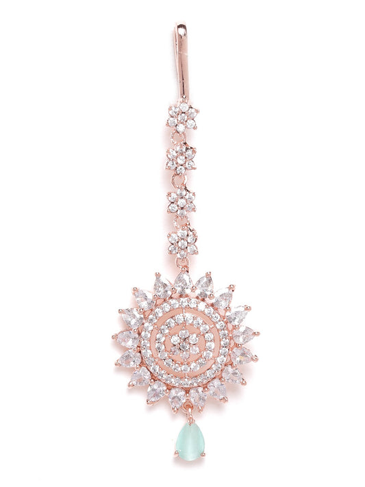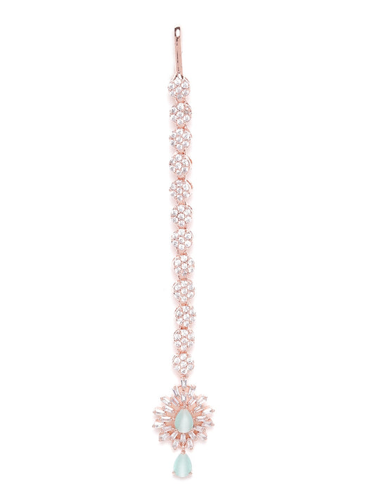 Sea Green Rose Gold-Plated CZ Stone-Studded Handcrafted Maang Tika
