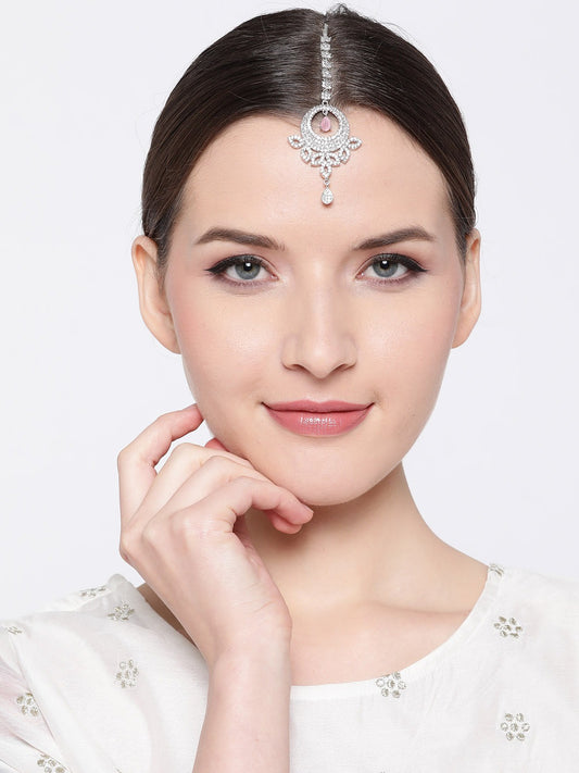 Pink Silver-Plated CZ Stone-Studded Handcrafted Maang Tika