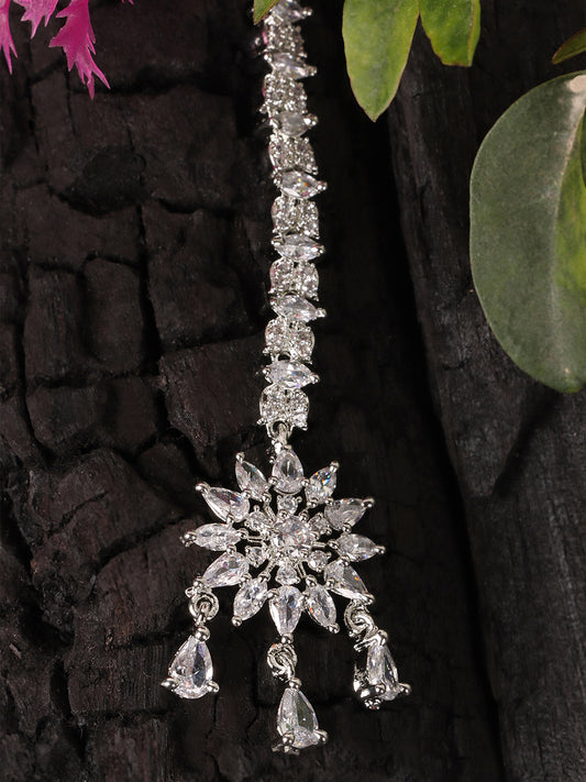 Silver-Plated & White AD-Studded Circular Shape Maangtika