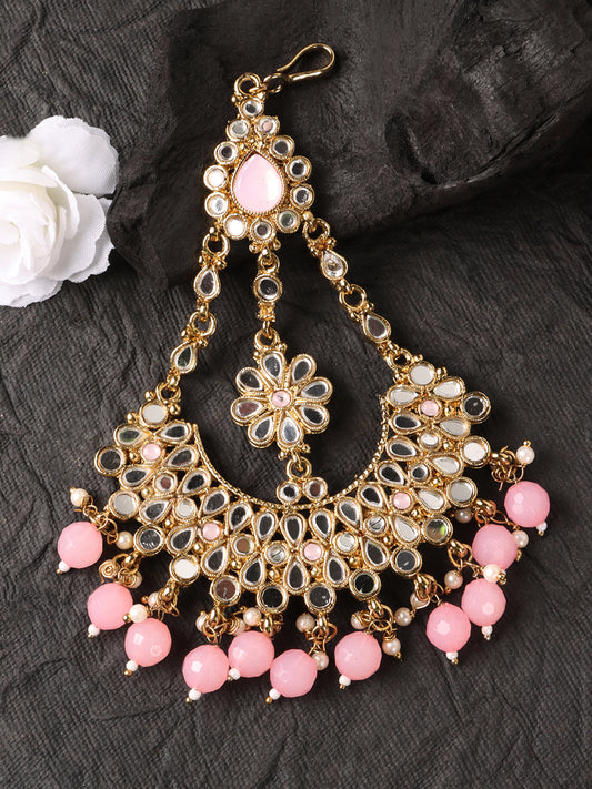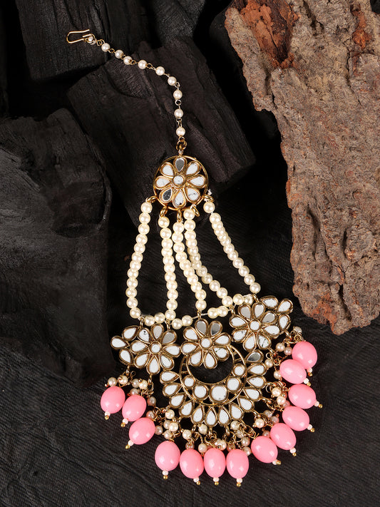 Gold-Plated White & Pink Kundan-Studded & Beaded Handcrafted Jhumar Passa
