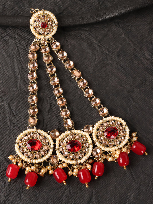Gold-Plated & Red Kundan-Studded & Pearl Beaded Jhumar Passa
