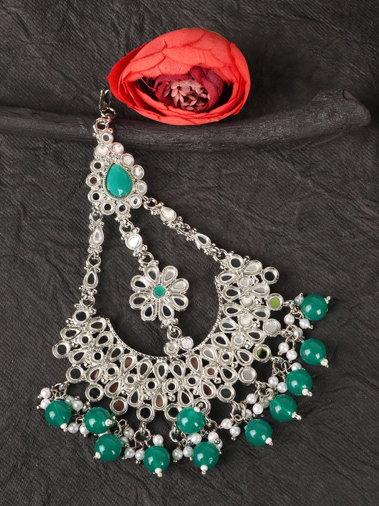 Silver-Plated Green Kundan Studded Jhumar Passa
