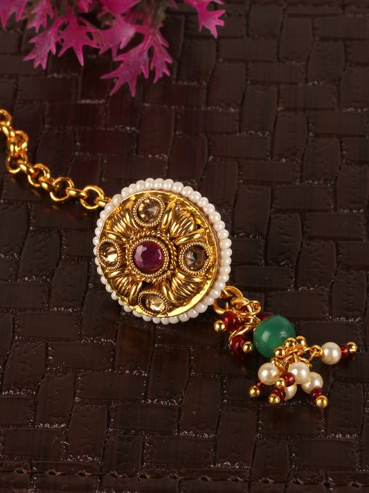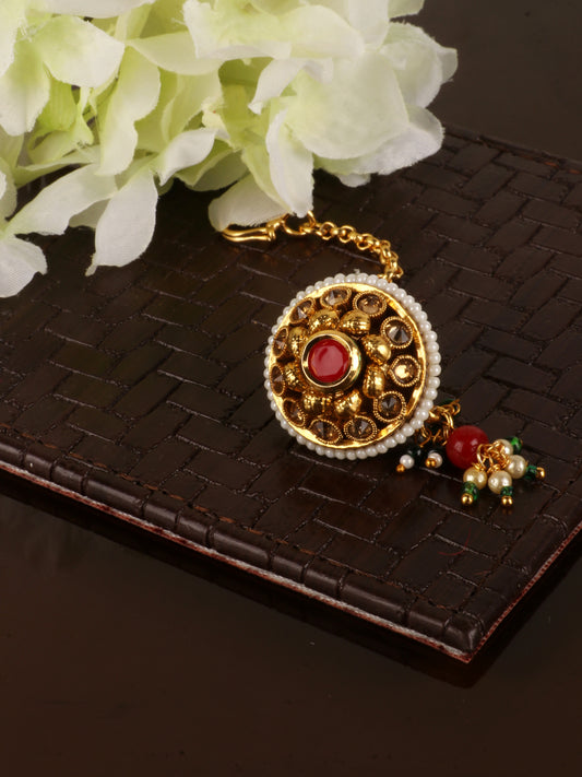 Gold-Plated & Red Kundan-Studded & Pearl Beaded Borla Maang Tikka