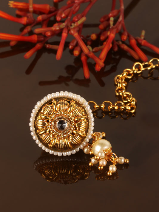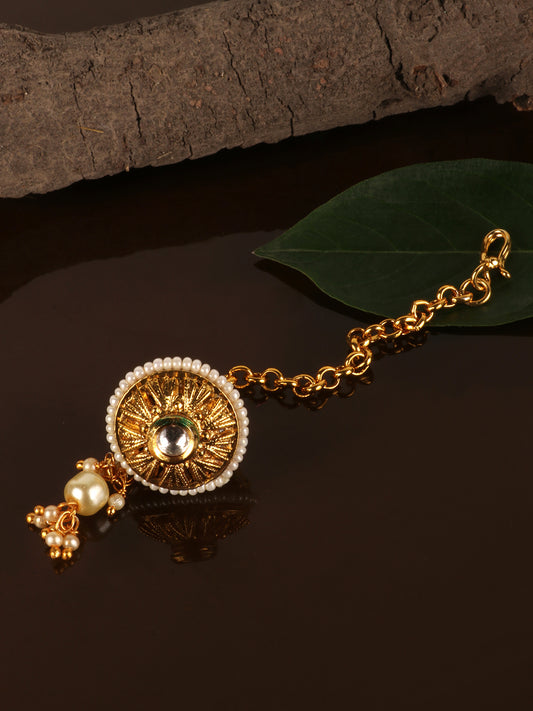 Gold-Plated & White Kundan Pearl Beaded Borla Maang Tikka