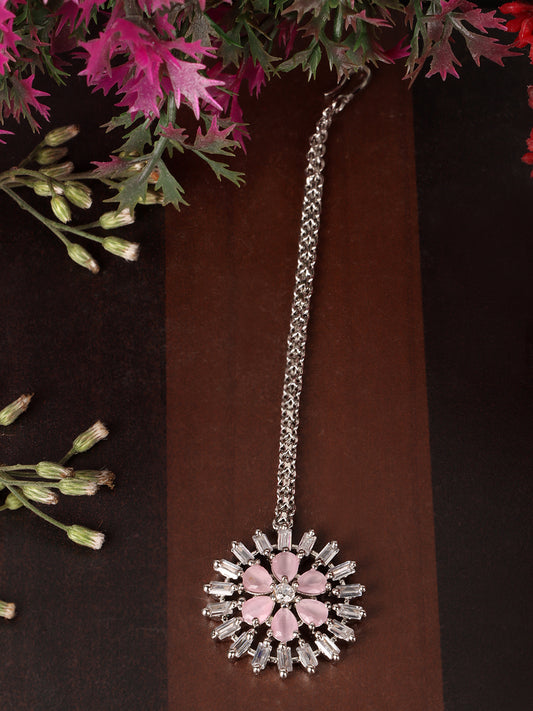 Silver-Plated White & Pink AD-Studded Handcrafted Maang Tikka