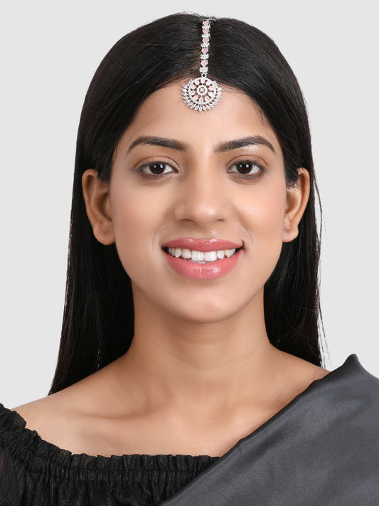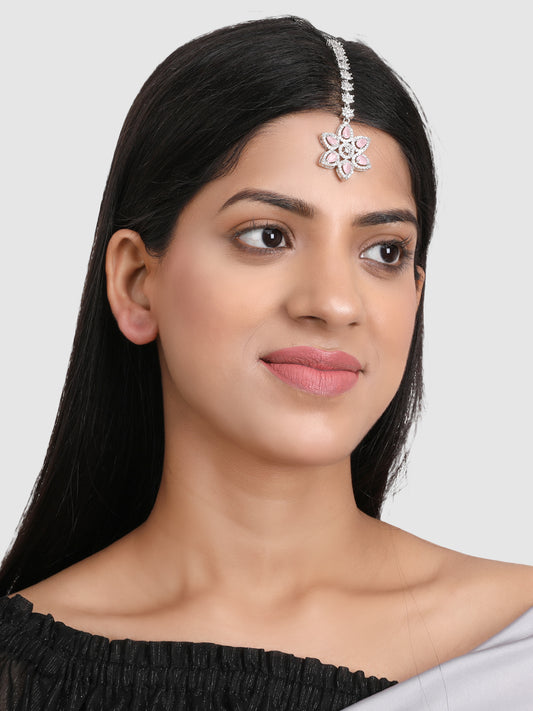 Silver-Plated White & Pink AD-Studded Maangtikka
