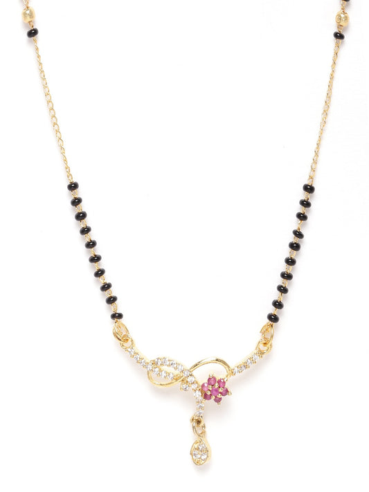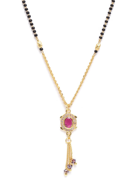 Black & Magenta Gold-Plated AD-Studded & Beaded Mangalsutra