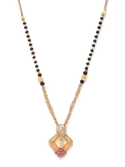 Black & Magenta Gold-Plated Beaded & AD-Studded Mangalsutra