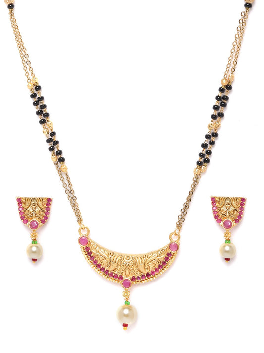 Black & Pink Gold-Plated Stone-Studded & Beaded Mangalsutra & Earrings Set