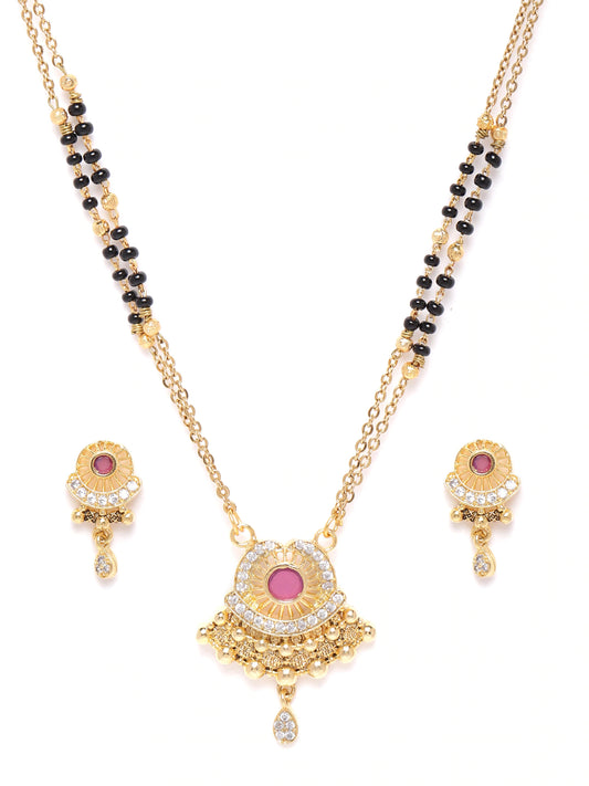 Black & Pink Gold-Plated AD-Studded & Beaded Mangalsutra & Earrings Set