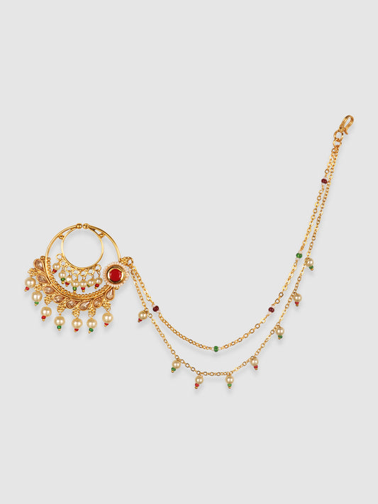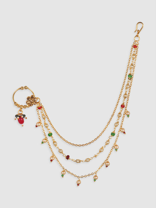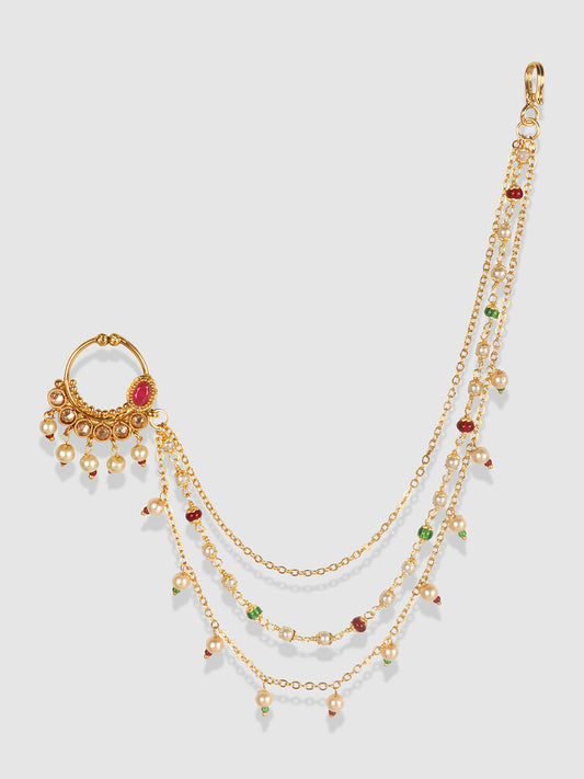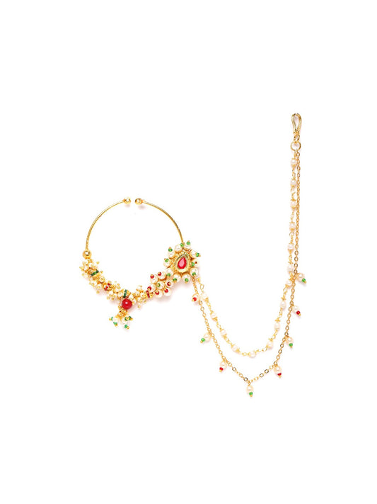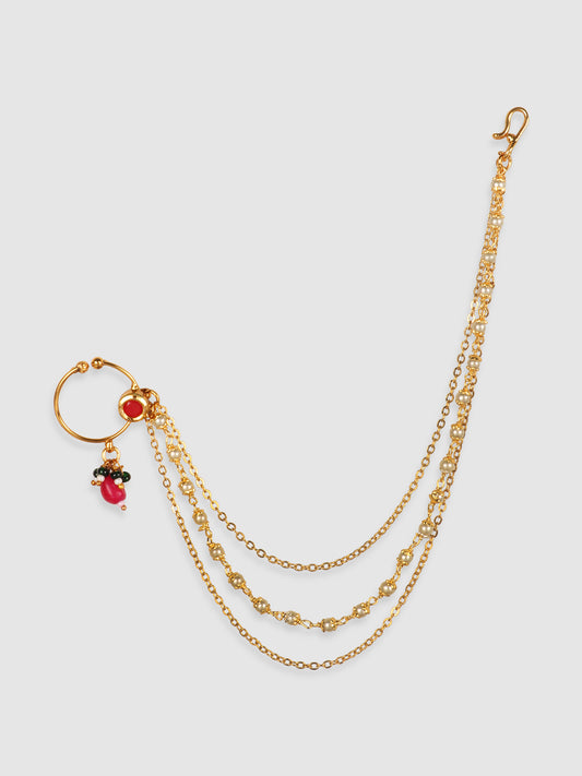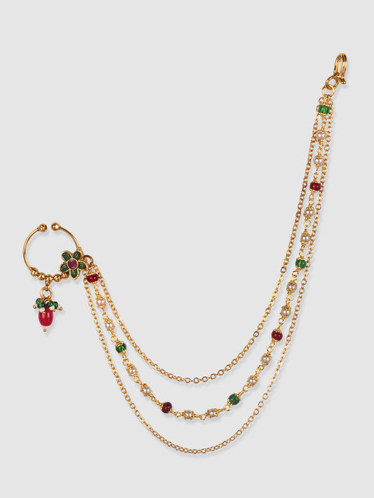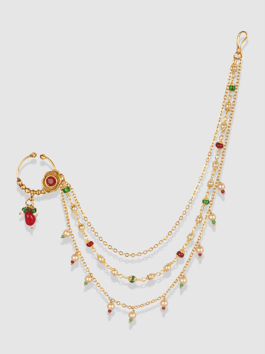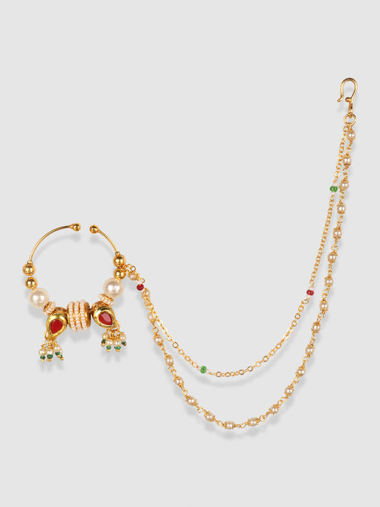 Gold-Plated Red & Green Pearl Studded Chained Nose Ring