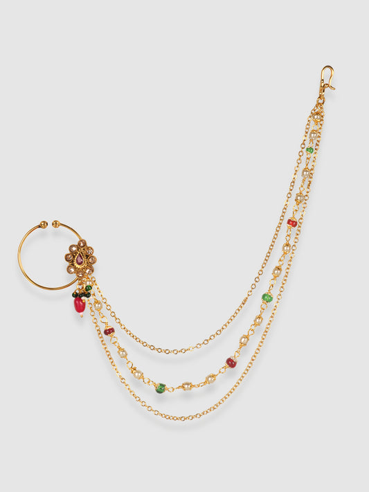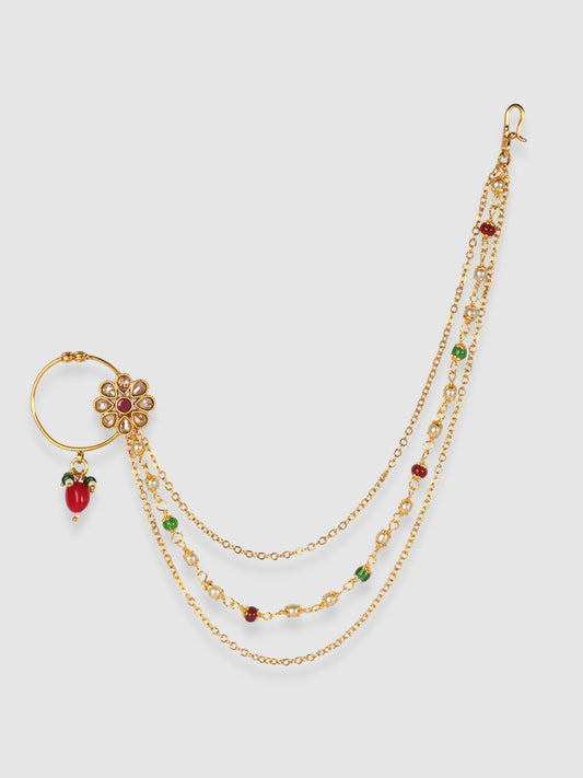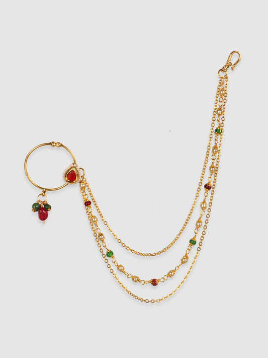 Gold-Plated Green & Red Stone-Studded & Pearl Beaded Vilandi Chained Nosering