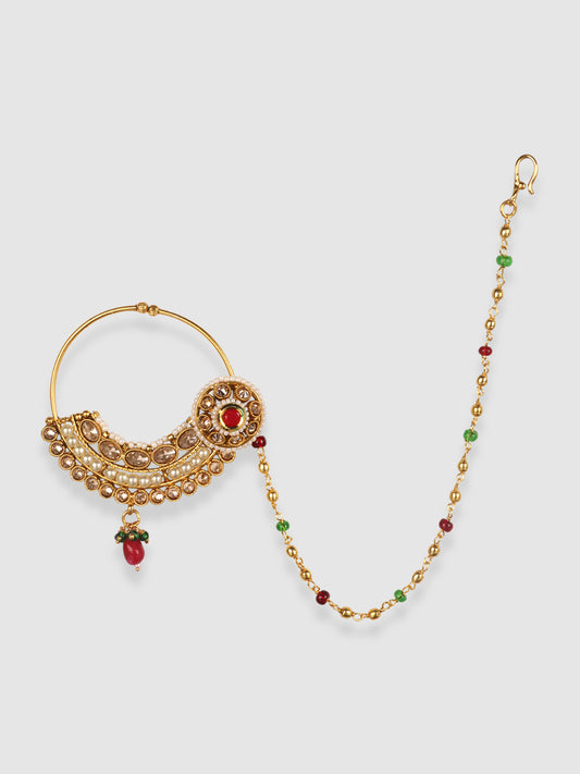 Red & Green Gold-Plated Handcrafted Stone and Pearl-Studded Chained Nose Ring