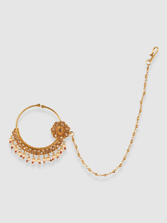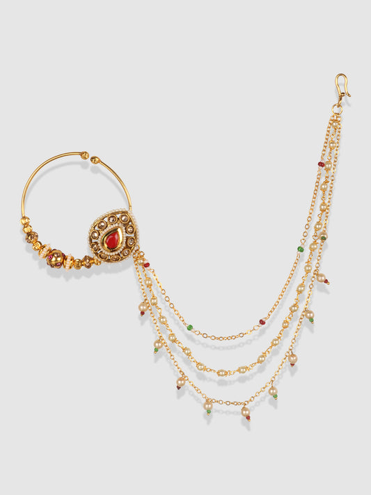 Gold-Plated Beige Kundan & Ruby-Studded Handcrafted Chained Nose Ring