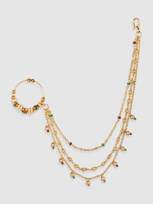 Gold-Toned & Beige Beaded Chained Gold-Plated Nose Ring