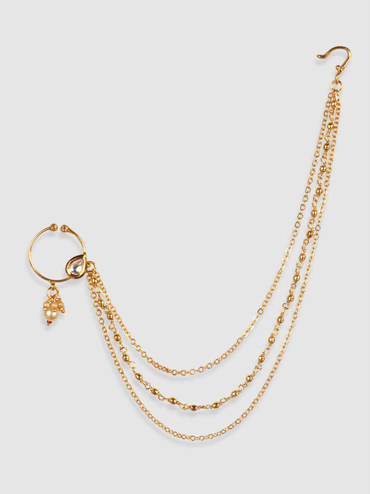 Gold-Plated Handcrafted Stone Pearl-Studded Chained Nose Ring