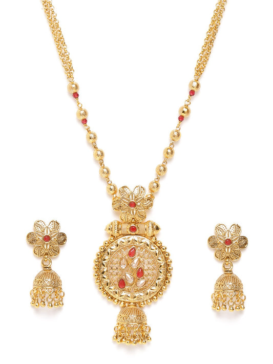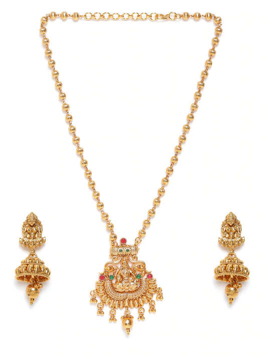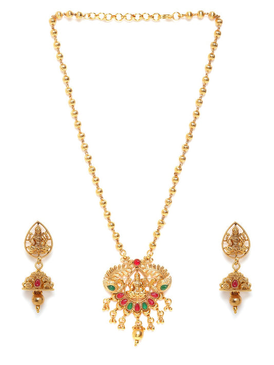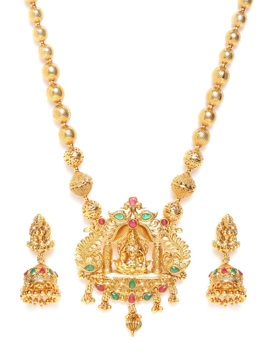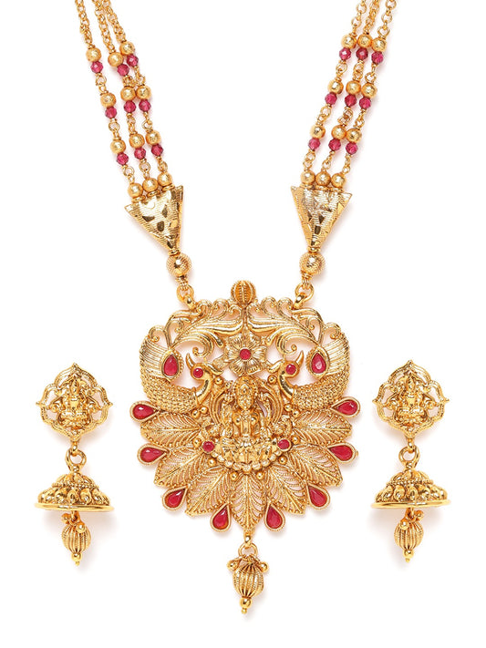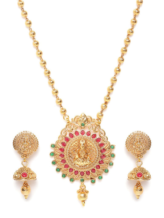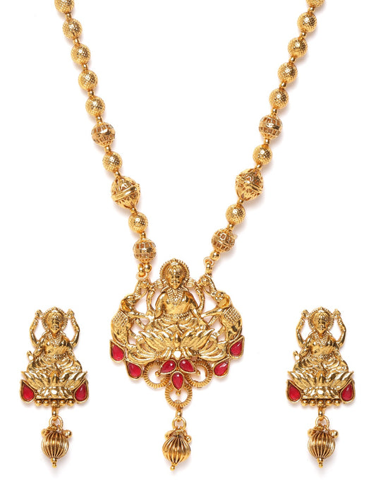 Red Gold-Plated Stone-Studded Goddess Lakshmi Handcrafted Jewellery Set