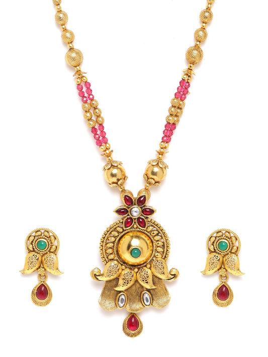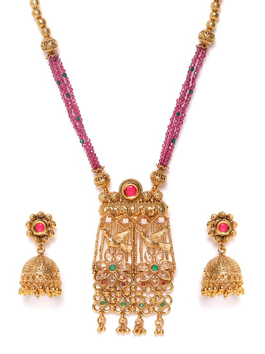 Pink Gold-Plated Handcrafted Stone-Studded Beaded Jewellery Set