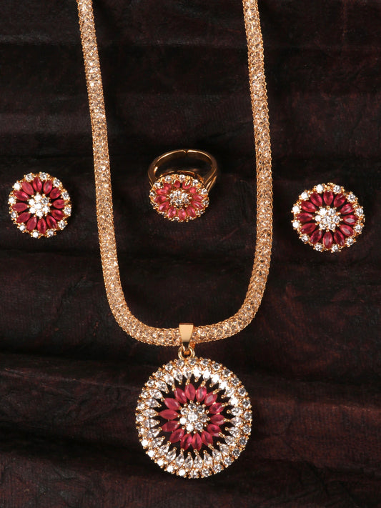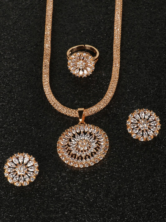 Pink Gold-Plated American Diamond-Studded Floral Shaped Jewellery Set
