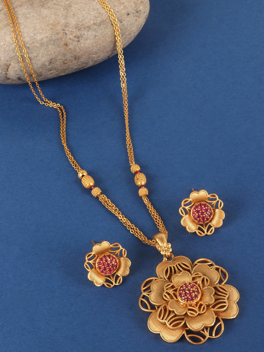 Gold-Plated & Pink Self Designer Floral Pendant & Earring Set
