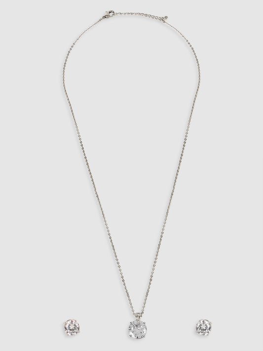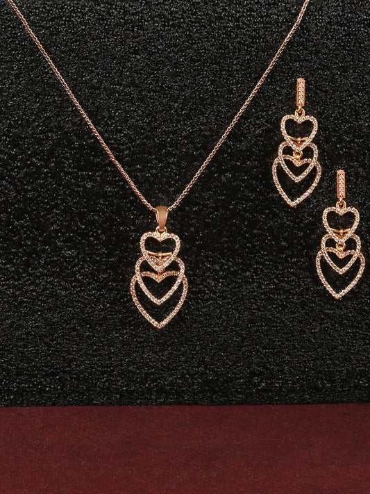 Rose Gold-Plated AD Studded Heart Shaped Pendant with Chain & Earrings