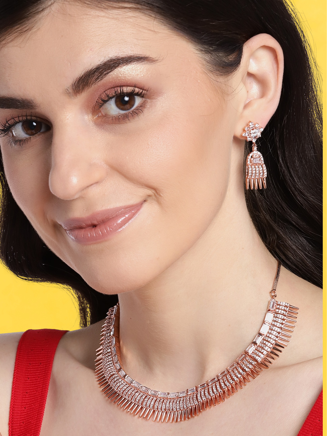 Rose Gold-plated AD-studded handcrafted necklace, secured with a hook closure